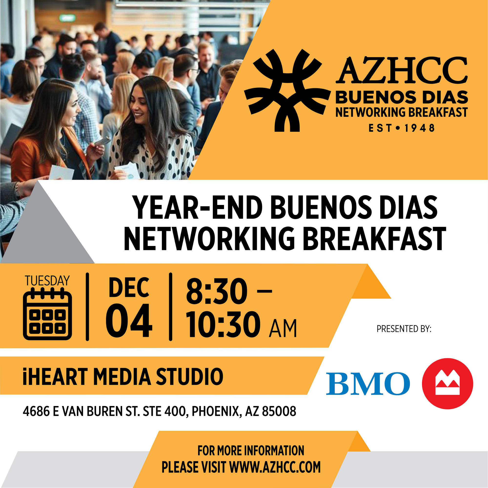 Start your morning con propósito at our End-of-Year Buenos Días Networking Breakfast, proudly presented by BMO Bank. As 2025 comes to a close, we’re bringing together emprendedores, small business owners, and professionals from across our diverse Latino and local business community for a morning filled with energy, connection, and celebration.