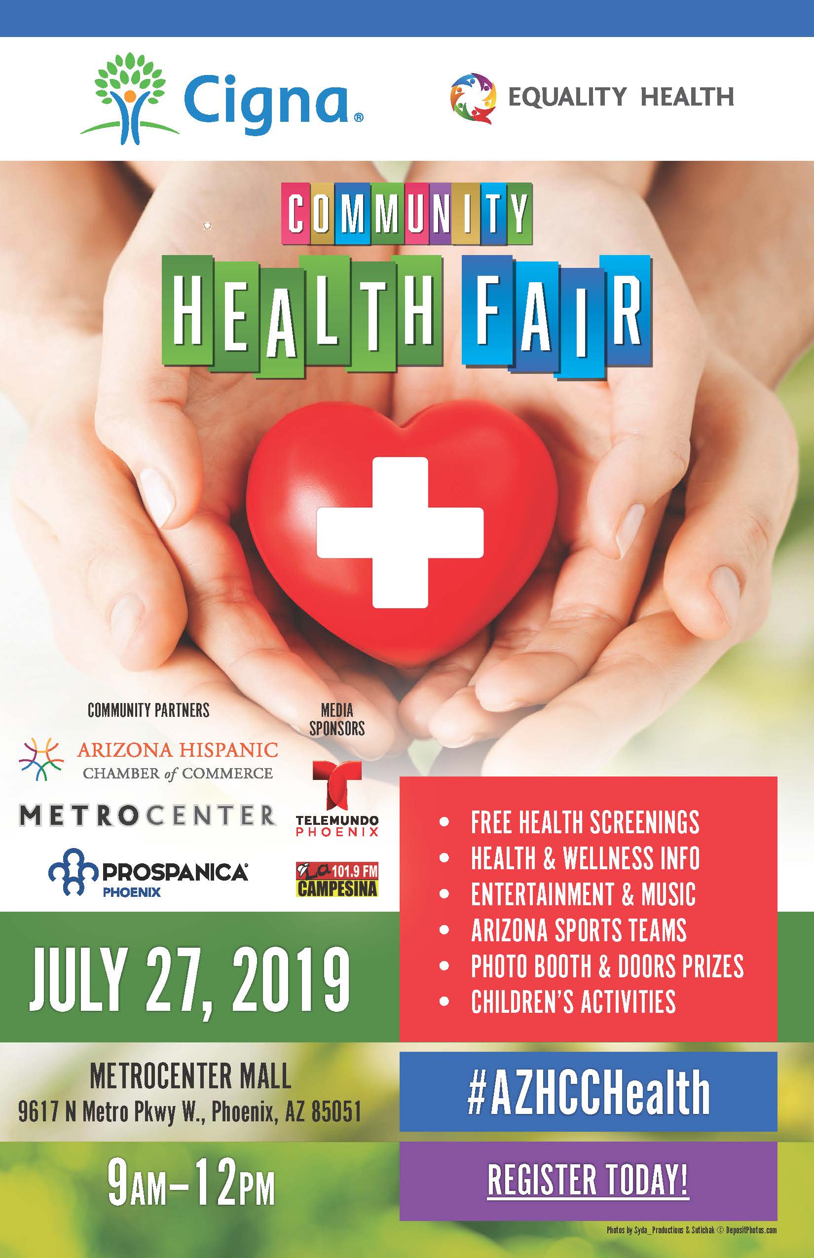 The Arizona Hispanic Chamber of Commerce would like to invite you this summer for the 4th Annual Community Health Fair on July 27, 2019 from 9:00am-12:00pm at Metro Center Mall. This FREE event provides members of the community with health screenings, health & wellness information, and various family friendly activities!